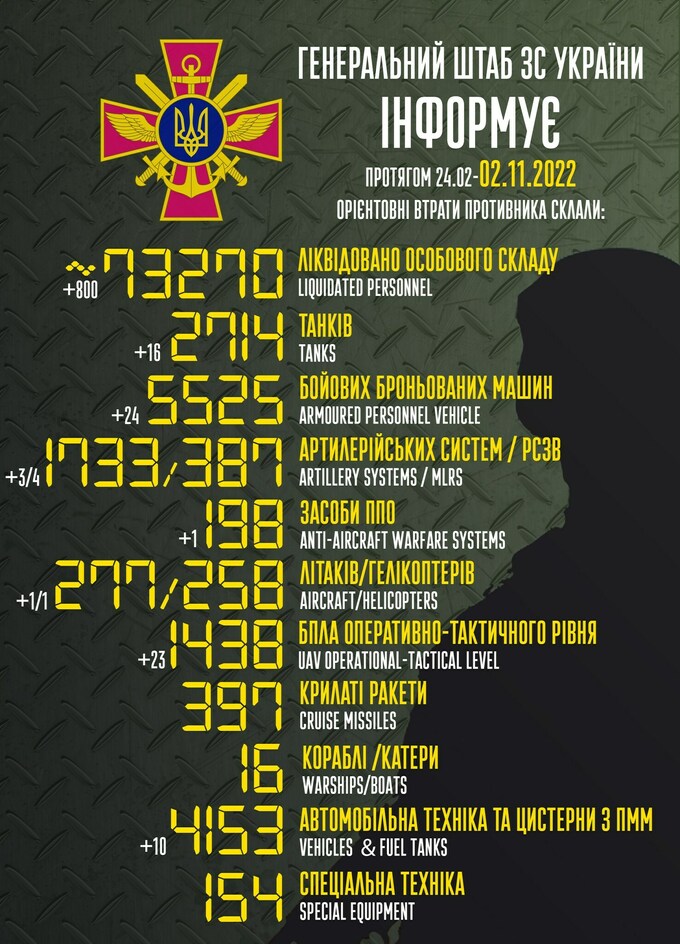 Пропонуємо до вашої уваги зведення загальних бойових втрат Росії з 24.02 по 02.11.