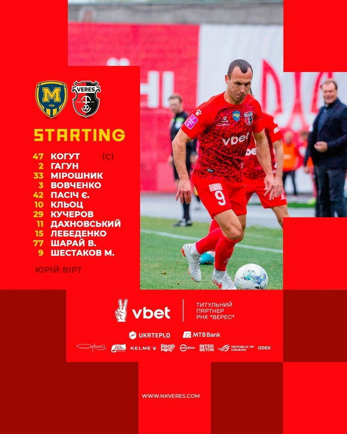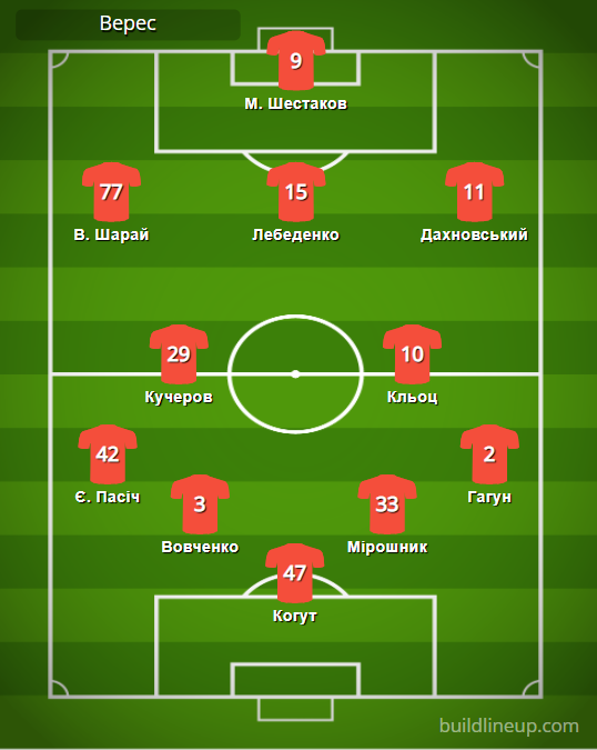 «Верес»: Когут – Є. Пасіч, Вовченко, Мірошник, Гагун – Кучеров, Кльоц (Курко, 90+1) – В. Шарай (С. Шестаков, 90+1), Лебеденко (С. Шарай, 82), Дахновський (Сергійчук, 82) – М. Шестаков (Гайдучик, 67).