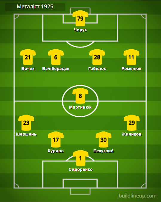 «Металіст 1925»: Сидоренко – Шершень, Курило, Безуглий, Жичиков – Мартинюк – Бичек (Дмитренко, 56), Вачіберадзе (Русин, 69), Габелок (Кравченко, 79), Ременюк (Капінус, 79) – Чирук (Зубков, 56).