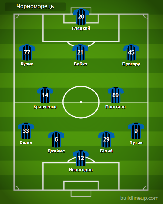 «Чорноморець»: Непогодов – Селін (Салюк, 69), Джеймс, Білий, Путря – С. Кравченко (Войтіховський, 81), Політило (Плакса, 46) – Кузик, Бобко (Наумець, 46), Брагару – Гладкий (Кубемба, 69).