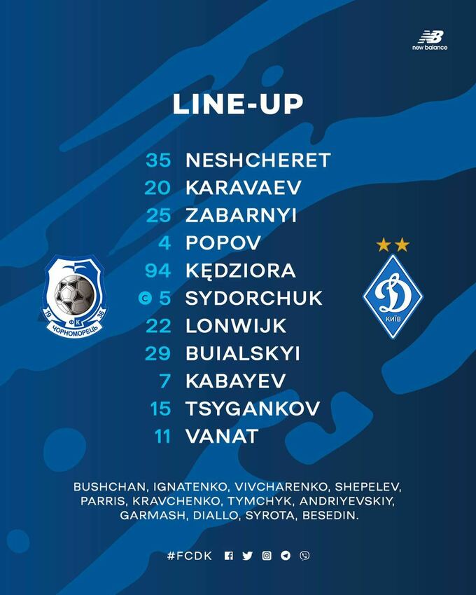 Запасні: Бущан, Ігнатенко, Шепелєв, Андрієвський, Тимчик, Діалло, Бєсєдін.