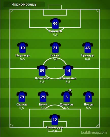 «Чорноморець»: Непогодов, Єрмаков, Путря, Білий (Селін, 89), Салюк, Краченко, Політило, Брагару (Кузик, 84), Бобко (Гладкий, 46), Наумець (Бадібанга, 72), Кубемба (Войтіховський, 72).