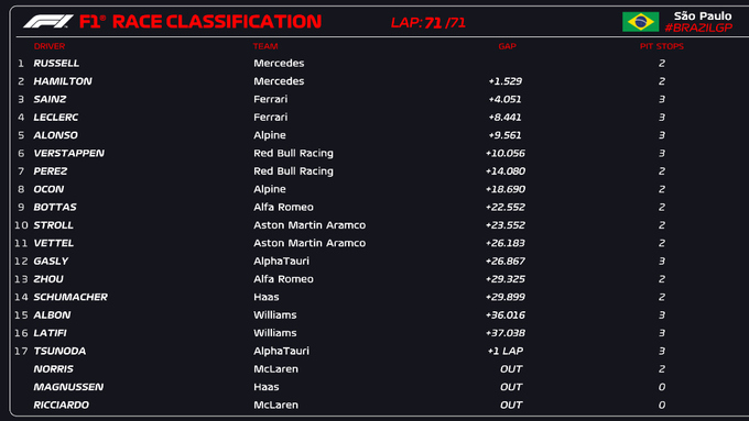 Відбулася гонка у рамках Гран-прі Бразилії. Переможцем став пілот Мерседеса Джордж Расселл. Для британця це перша перемога у кар'єрі Формули-1. Для Мерседеса це перша у сезоні перемога.