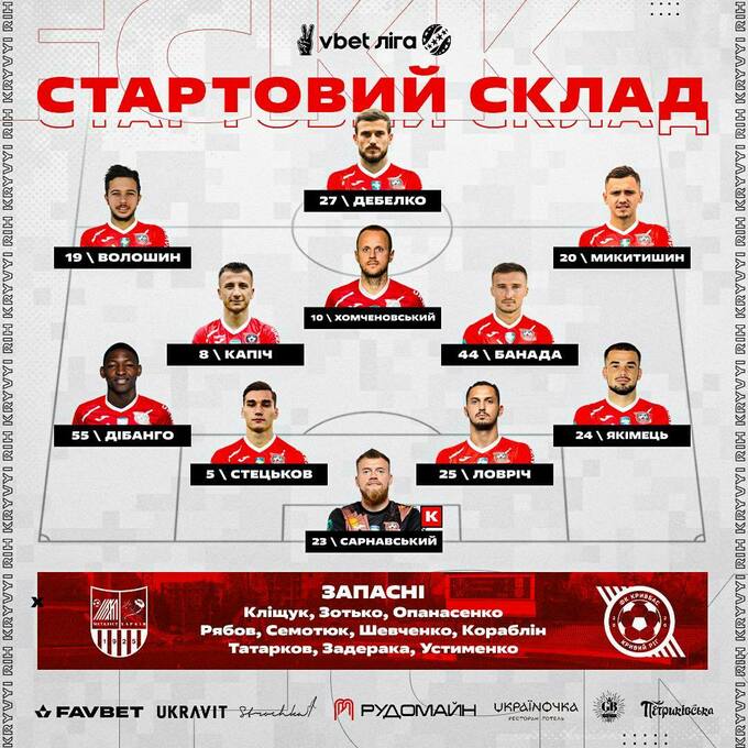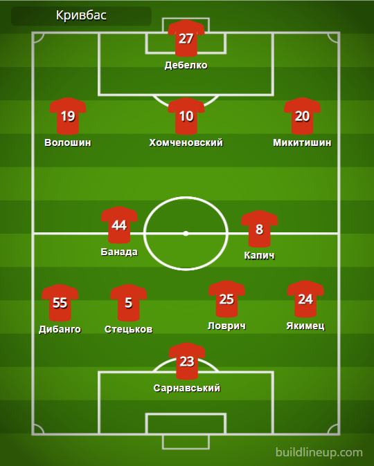 «Кривбас»: Сарнавський – Дібанго, Стецьков (Зотько, 46), Ловрич, Якімець – Банада, Капіч (Татарков, 90+2) – Волошин, Хомченовський, Микитишин (Задерака, 46) – Дебелко (Устименко, 89).