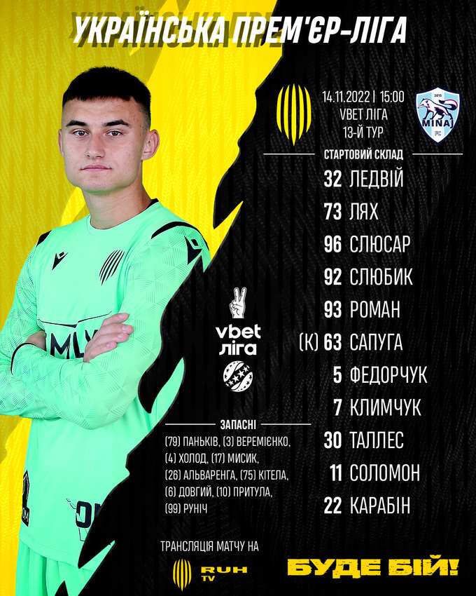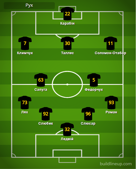 «Рух»: Ледвій – Лях, Слюбик, Слюсар, Роман – Сапуга, Федорчук (Довгий, 39) – Климчук, Таллес, Соломон-Отабор – Карабін (Альваренга, 70).