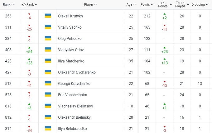 Щодо українців, то непогано додали Владислав Орлов та Ілля Марченко. На жаль, вони все ще перебувають у п'ятій сотні рейтингу. Віталій Сачко втратив одразу 25 позицій та опустився до четвертої сотні. Серед претендентів на кваліфікацію турнірів Grand Slam залишається лише Олексій Крутих.