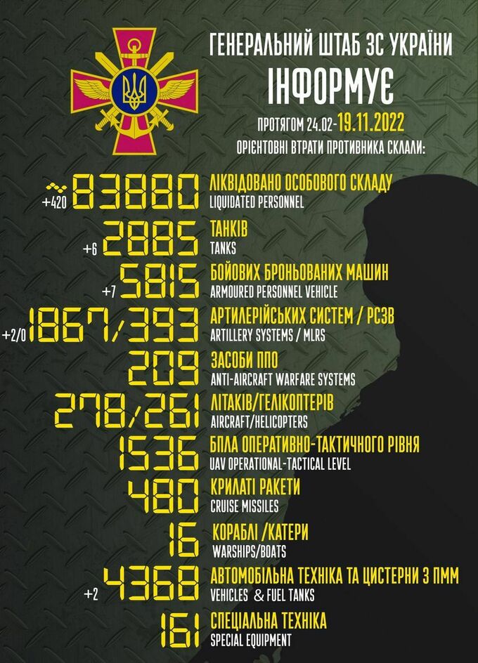 Пропонуємо до вашої уваги зведення загальних бойових втрат росії з 24.02 по 19.11.
