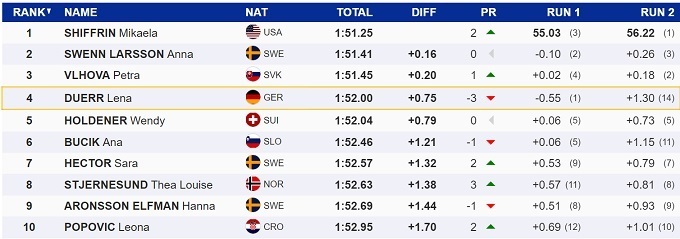 Переможцем слалому стала американка Мікаела Шиффрін, для якої це 75-та перемога у кар'єрі на Кубку світу. Вона випередила шведку Анну Свенн-Ларссон і словачку Петру Влхову.