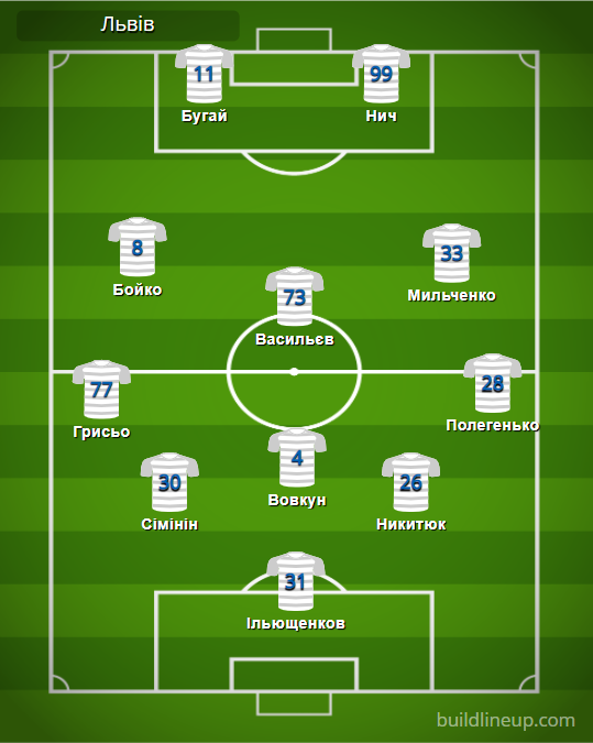 «Львів»: Ільющенков – Грисьо, Сімінін (Муравський, 53), Вовкун (Шишка, 52), Никитюк, Полегенько (Крушинський, 53) – Бойко (Ременяк, 67), Васильєв, Мильченко – Бугай, Нич.