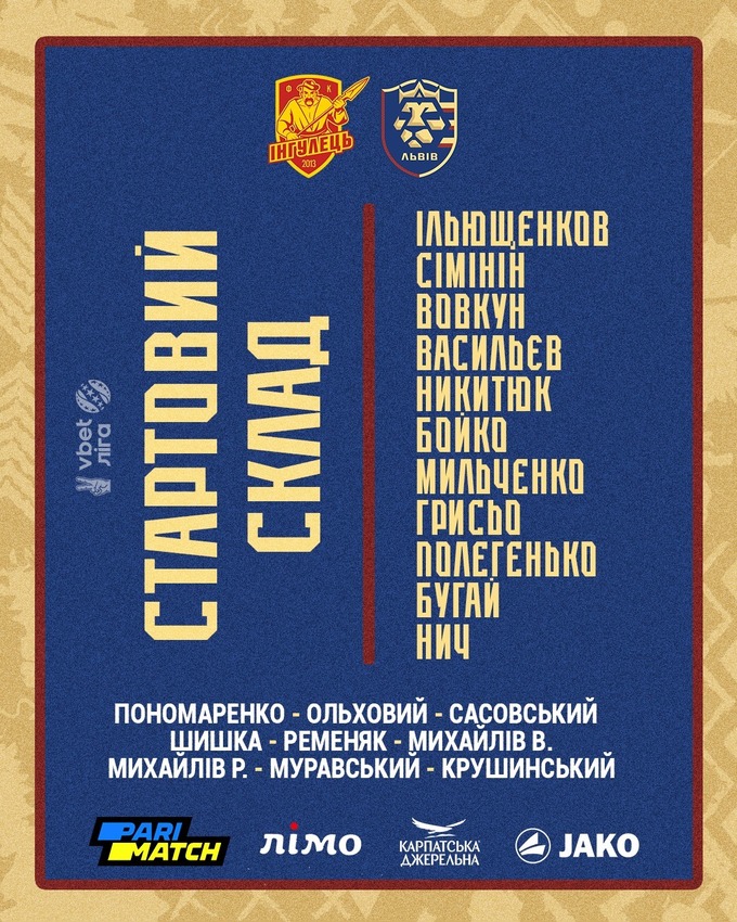 Запасні: Пономаренко, Ольховий, Р. Михайлів, В. Михайлів, Сасовський.