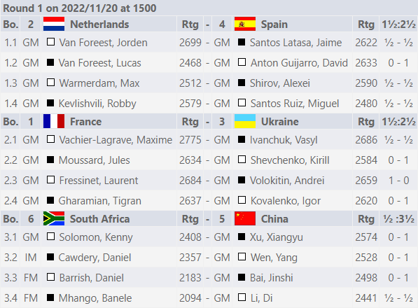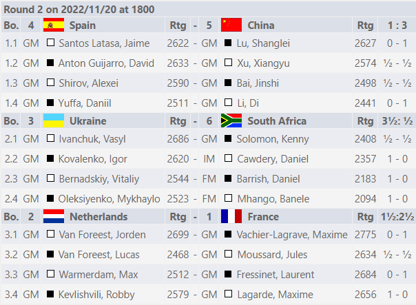 Збірна України розпочала виступ із двох перемог! Спочатку синьо-жовті перемогли Францію (2.5:1.5), а згодом розгромили команду ПАР (3.5:0.5). Дві перемоги за день здобув Ігор Коваленко.