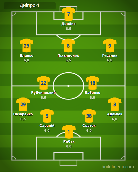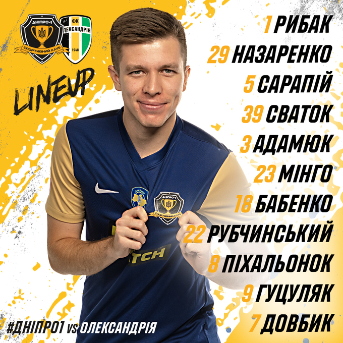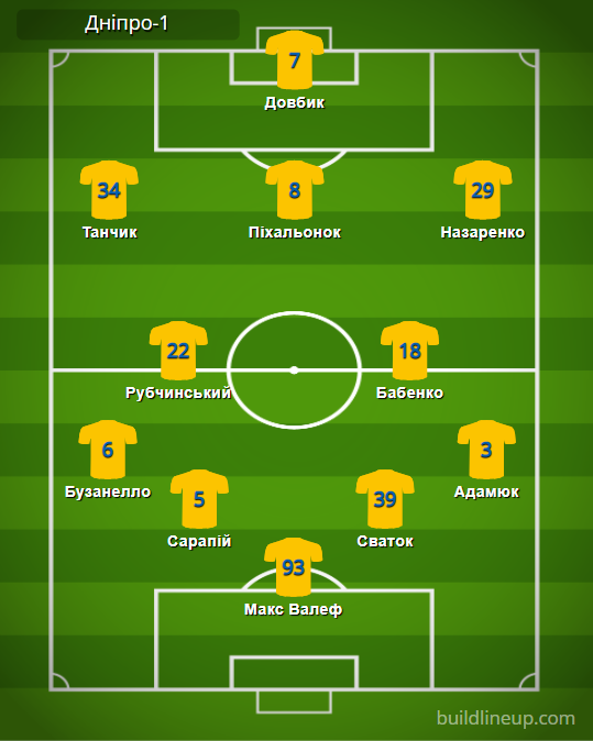 «Дніпро-1»: Рибак – Назаренко (Є. Пасіч, 61), Сваток, Сарапій, Адамюк (Хайнер, 84) – Рубчинський (Танковський, 61), Бабенко (Когут, 84) – Бланко (Пеглоу, 72), Піхальонок, Гуцуляк – Довбик.