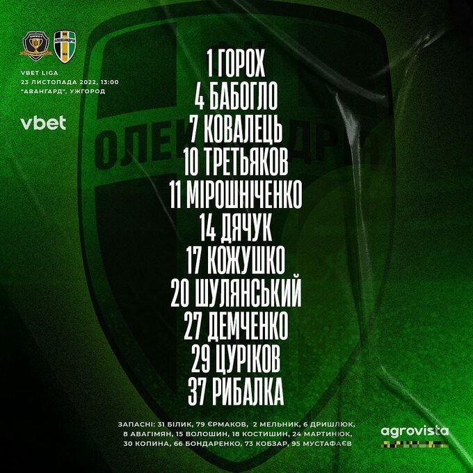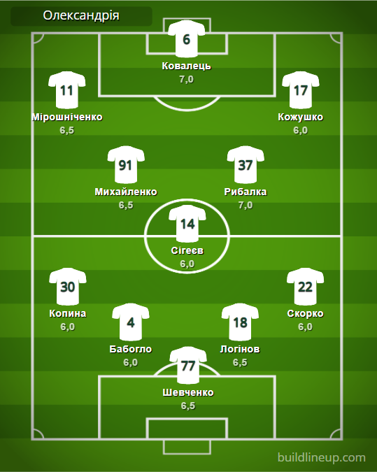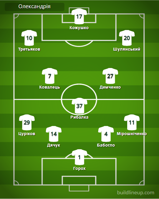«Олександрія»: Шевченко – Копина (Бондаренко, 90+2), Бабогло, Логінов, Скорко – Михайленко, Сігеєв (Матюшенко, 90+2), Рибалка – Мірошніченко, Ковалець (Кулаков, 70), Кожушко (Мустафаєв, 46).