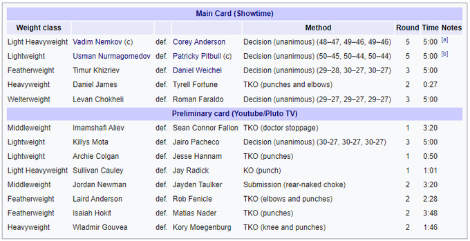 У співголовнії події Усман Нурмагомедов переміг Пітбуля (Патрікі Фрейре) з Бразилії (50–45, 50–44, 50–44).