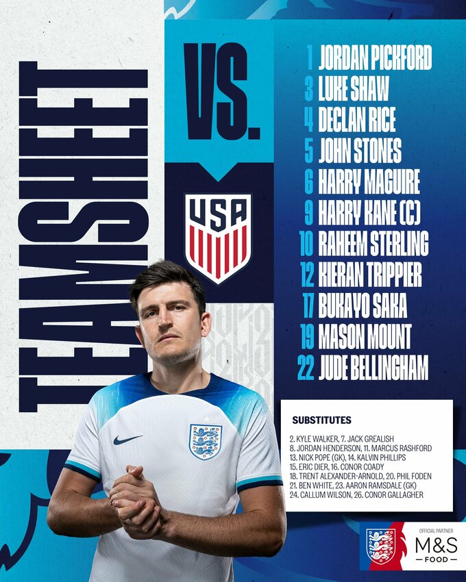 У п'ятницю, 25 листопада, відбудеться поєдинок групи В чемпіонату світу, в якому зустрінуться збірні Англії та США. Матч пройде у місті Ель-Хаур на стадіоні «Ель-Байт», стартовий свисток пролунає о 21:00 за київським часом.