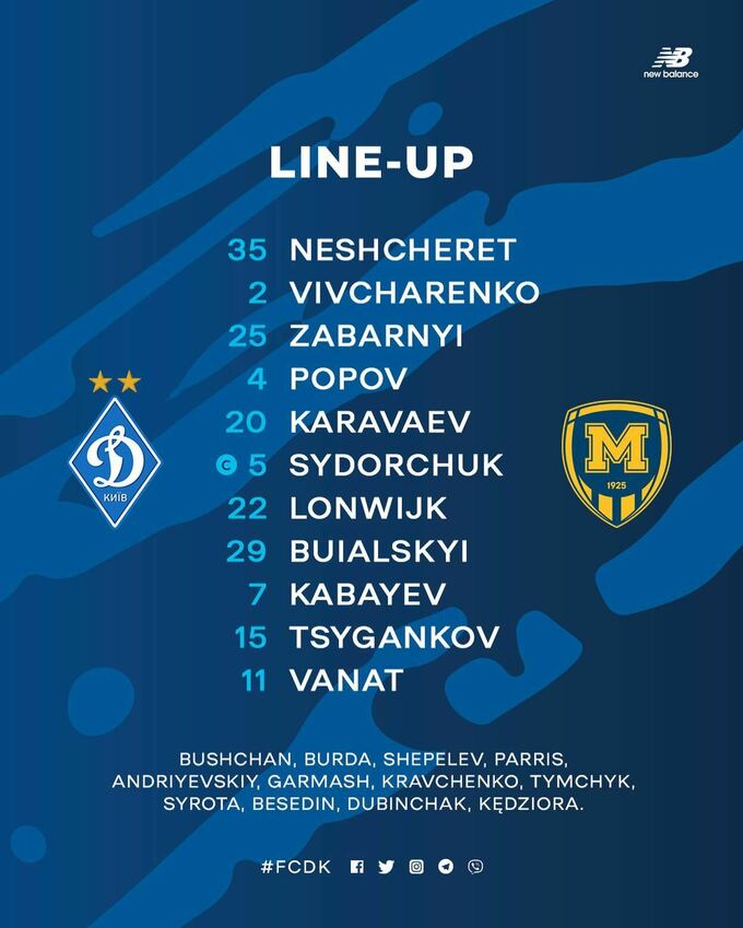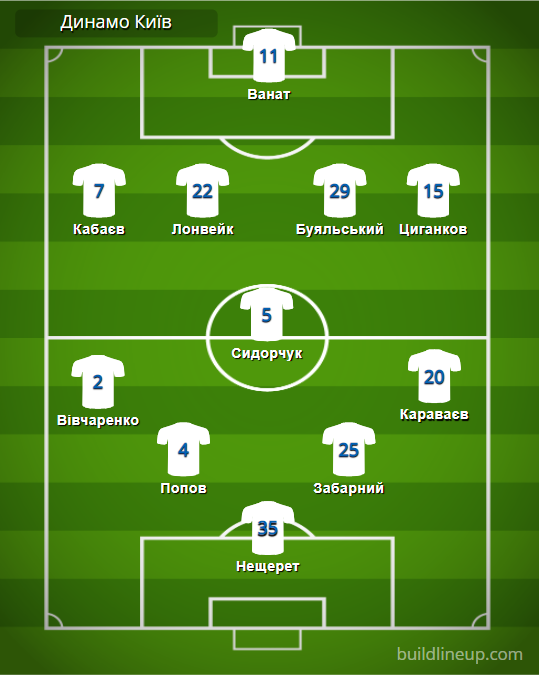 «Динамо» Київ: Нещерет – Вівчаренко (Дубінчак, 62), Попов, Забарний, Караваєв (Перріс, 83) – Сидорчук – Кабаєв (Гармаш, 46), Лонвейк (Шепелєв, 61), Буяльський, Циганков – Ванат (Бєсєдін, 46).