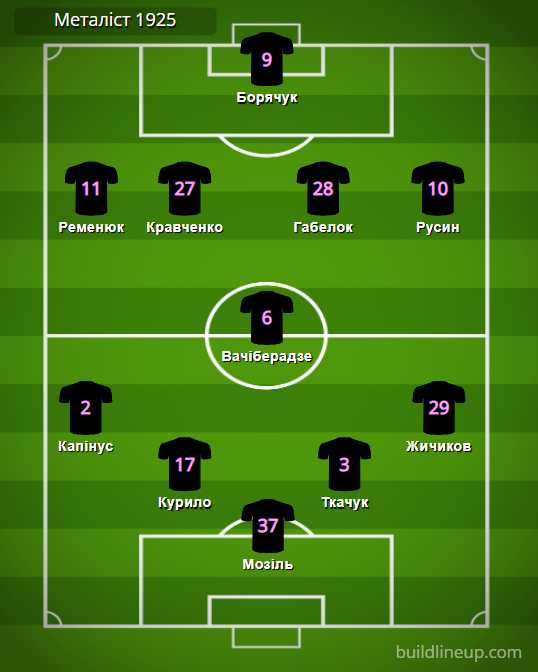 «Металіст 1925»: Мозіль – Капінус, Курило, Ткачук, Жичиков – Вачіберадзе (Мартинюк, 57) – Ременюк, Кравченко (Шершень, 83), Габелок, Русин – Борячук (Чирук, 76).