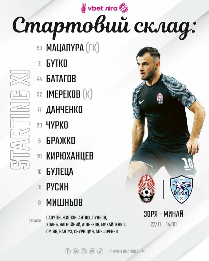 «Зоря»: Мацапура, Бутко, Батагов, Імереков, Данченко, Мішньов, Бражко, Булеца, Кірюханцев, Чурко, Русин.