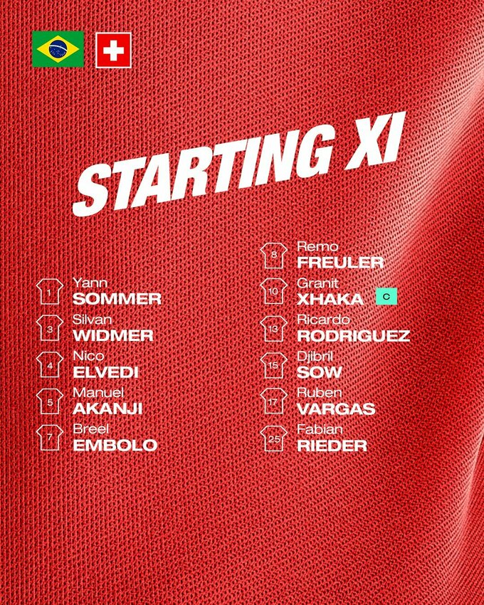 Швейцарія: Зоммер – Родрігес, Елведі, Аканджі, Відмер (Фрай, 86) – Фройлер – Джака, Рідер (Штеффен, 58) – Соу (Ебішер, 75) – Варгас (Фернандес, 58), Емболо (Сеферович, 75).