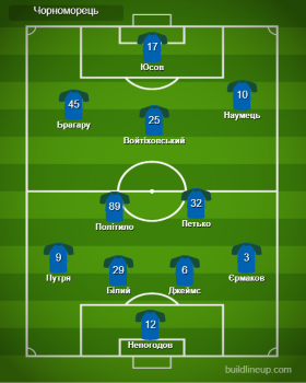 Чорноморець: Непогодов, Єрмаков, Джеймс, Путря, Білий (Гладкий, 78), Петько (Бобко, 78), Політило, Брагару, Юсов (Кузик, 67), Наумець (Бадібанга, 46), Войтіховський (Кубемба, 46).