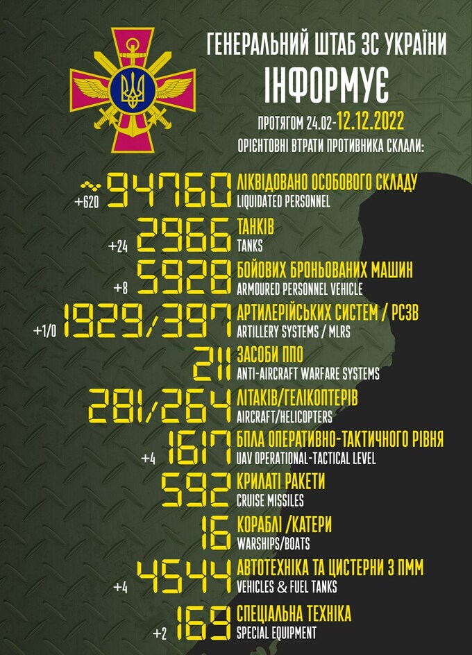 Пропонуємо до вашої уваги зведення загальних бойових втрат росії з 24.02 по 12.12.