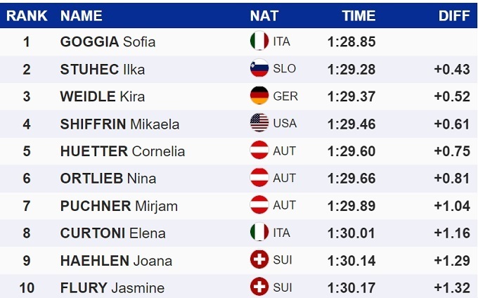 Зазначимо, що Годжа виступала із переломом руки. Під час учорашнього швидкісного спуску (друге місце) вона зламала дві фаланги кисті лівої руки, увечері перенесла операцію в Мілані та зуміла виступити у Швейцарії, незважаючи на травму.