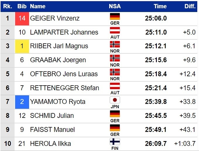 Німецький двоборець Вінценц Гайгер виграв другий особистий старт на етапі Кубка світу в австрійському Рамзау. Він випередив австрійця Йоханнеса Лампартера та лідера Кубка світу, норвежця Ярла Магнуса Ріїбера.