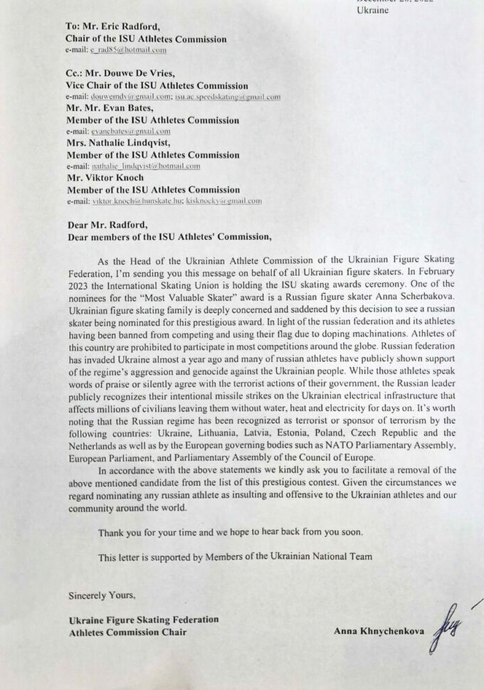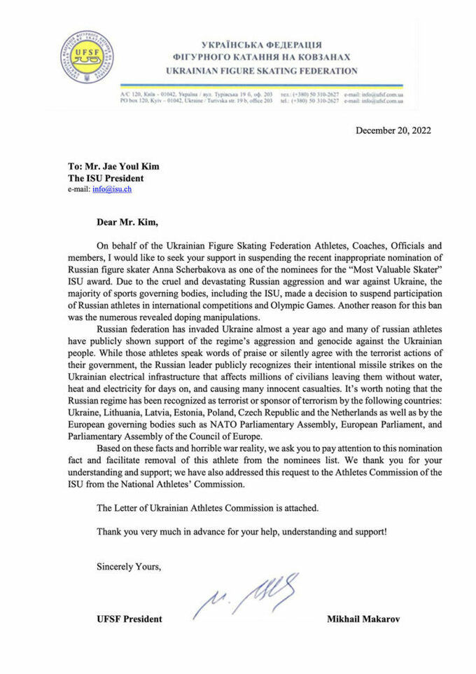 З відповідним листом до президента ISU Кім Чже Йоля від імені спортсменів, тренерів, офіційних осіб та членів УФФК звернувся президент української федерації Михайло Макаров. Ще одне звернення – голові Комісії атлетів ISU Еріку Редфорду спрямувала Комісія атлетів УФФК, яку очолює відома фігуристка Анна Хниченкова.