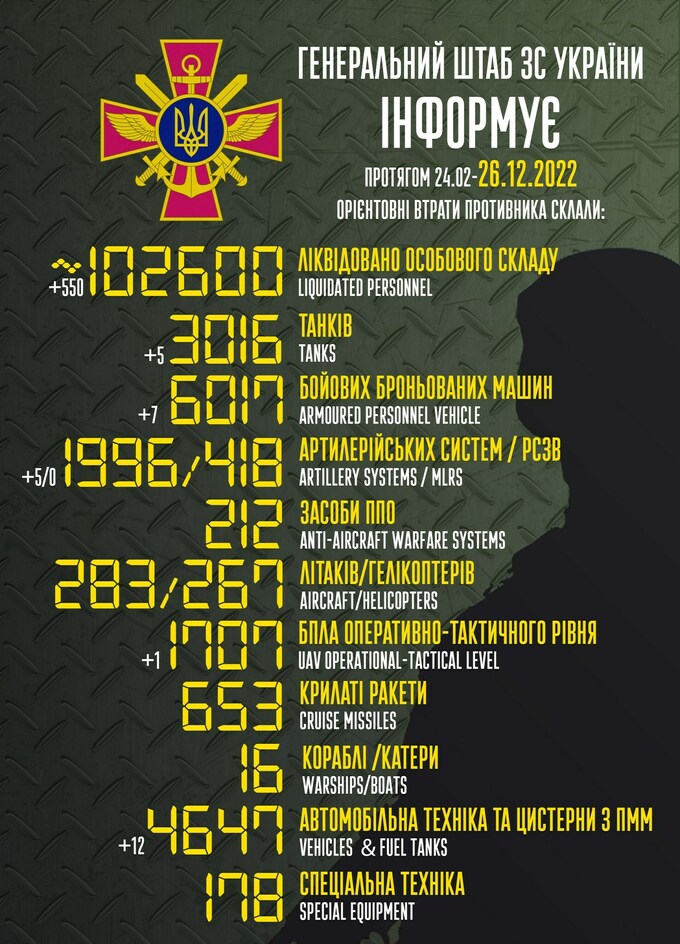 Генштаб збройних сил України повідомив про те, що за вчорашню добу вдалося орієнтовно знищити 550 російських окупантів, а загальні втрати ворога збільшилися до 102,6 тисячі осіб.