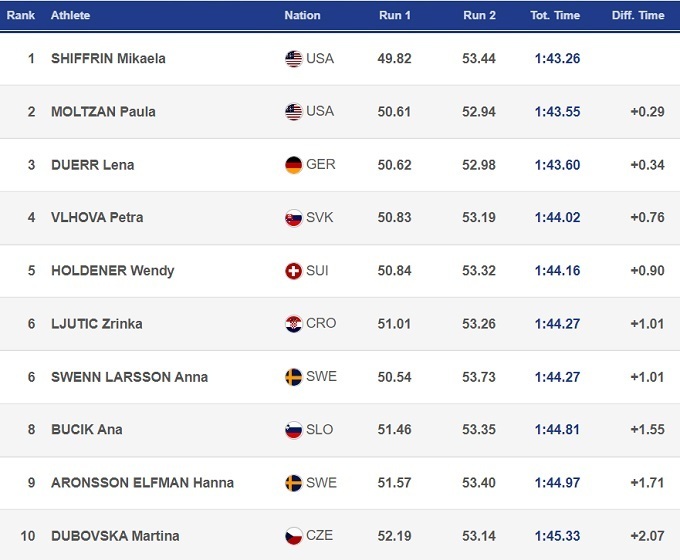 Другою стала партнерка Шиффрін зі збірної США Пола Мольцан, для якої це перший у кар'єрі подіум на Кубку світу. Топ-3 замкнула німкеня Лена Дюрр.