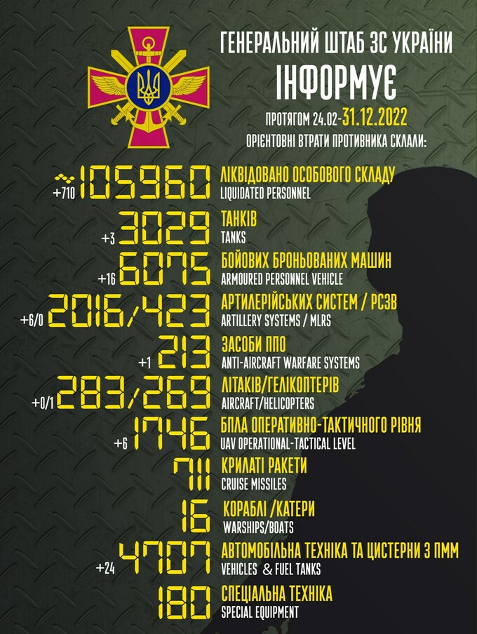Пропонуємо до вашої уваги зведення загальних бойових втрат росії з 24.02 по 31.12.