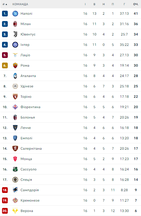 Лідери Серії A: Наполі (41), Мілан (36), Ювентус (34), Інтер (33), Лаціо, Рома (по 30), Аталанта (28).