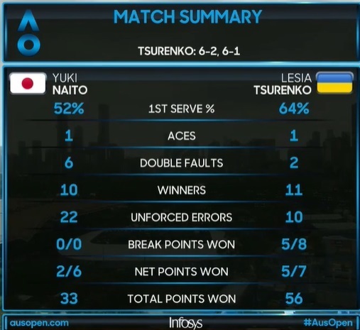 Леся Цуренко (Україна) – Юкі Найто (Японія) – 6:2, 6:1