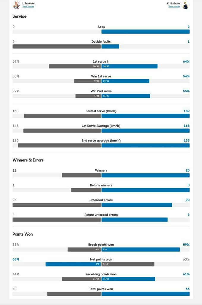 Зазначимо, що за матч Леся жодного разу не взяла своєї подачі. Було видно, що українка не готова на 100% фізично до матчу, Мухова просто перебігала українку. У другому сеті Цуренко навіть брала медичний тайм-аут.