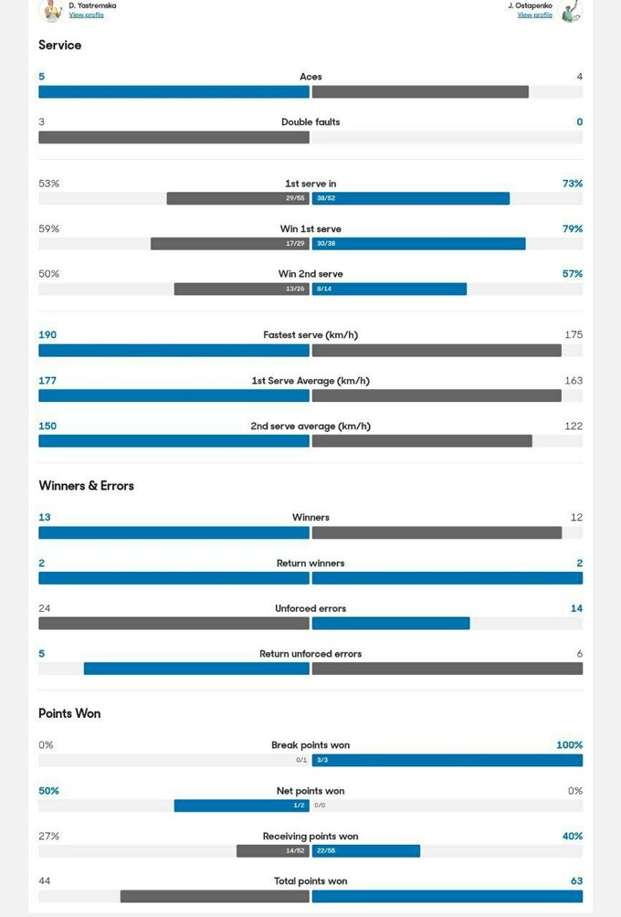 Зазначимо, що Ястремська жодного разу не зробила брейку у поєдинку. До слова, Остапенко є екс-п'ятою ракеткою світу. У 2017 році вона виграла Ролан Гаррос.