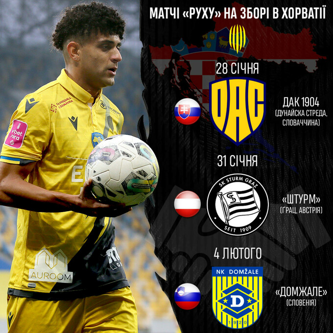 «Рух» зіграє 22 січня зі словацьким клубом ДАК 1904, 31-го числа зустрінеться з австрійським «Штурмом», а 4 лютого поміряється силами зі словенським «Домжале».