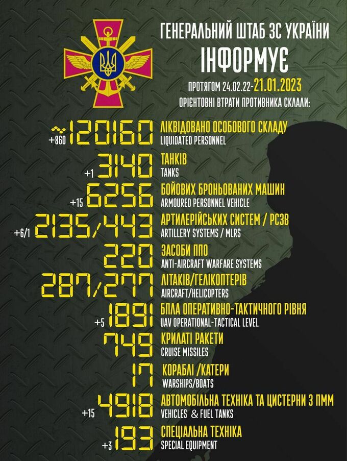 Пропонуємо до вашої уваги зведення загальних бойових втрат росії з 24.02.2022 по 21.01.2023.
