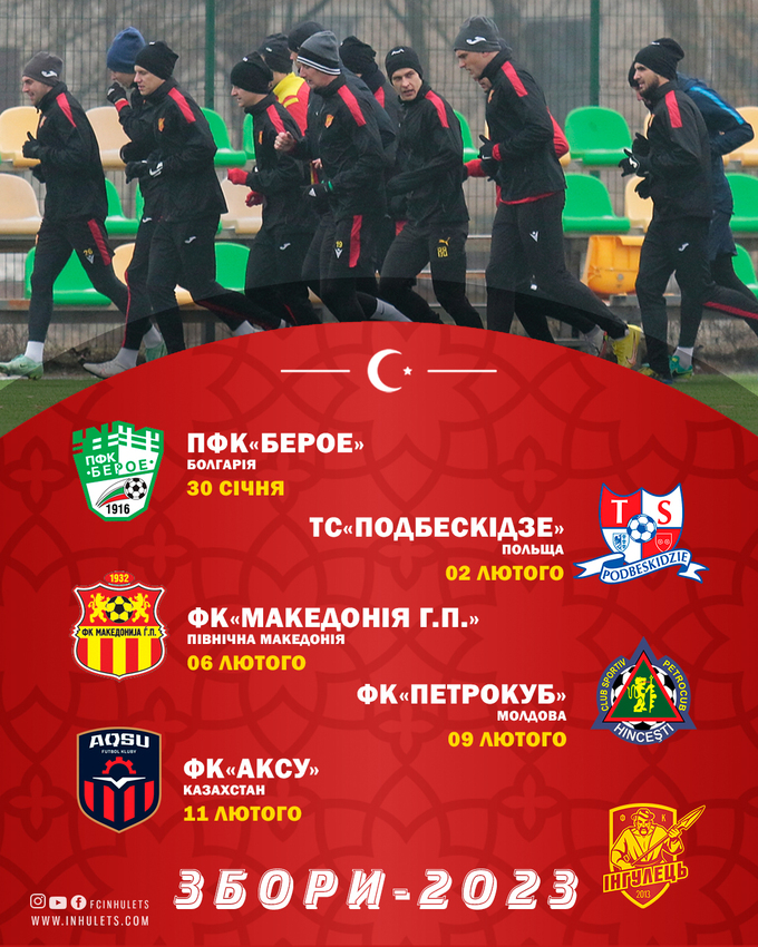 З 25 січня до 25 лютого «Інгулець» проведе збір у Туреччині. Стали відомі перші п'ять суперників команди Сергія Ковальця у Туреччині:
