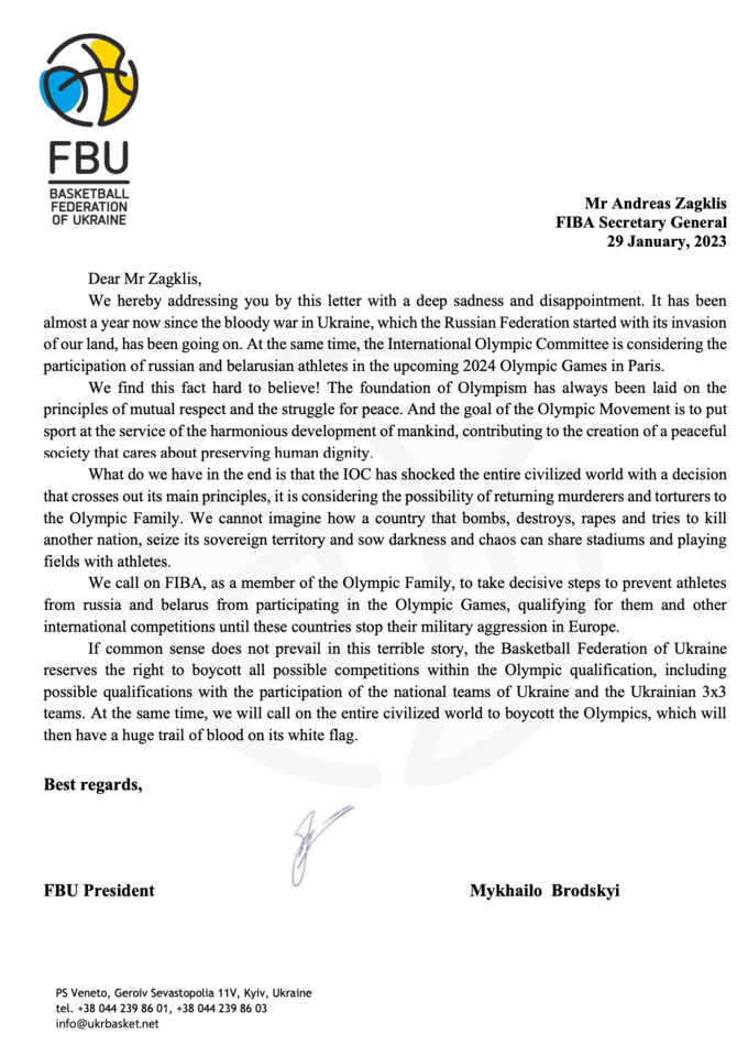 У своєму листі ФБУ закликала ФІБА вжити рішучих кроків щодо недопущення до участі в Олімпійських іграх, кваліфікації до них та інших міжнародних стартах спортсменів з росії і білорусії, допоки ці країни не припинять воєнну агресію в Україні.