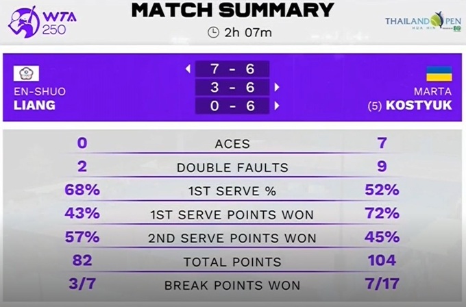 Марта Костюк (Україна) – Лян Еньшуо (Китайський Тайбей) – 6:7(7), 6:3, 6:0