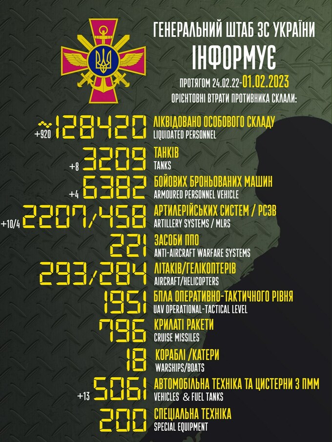 Пропонуємо до вашої уваги зведення загальних бойових втрат росії з 24.02.2022 по 01.02.2023.
