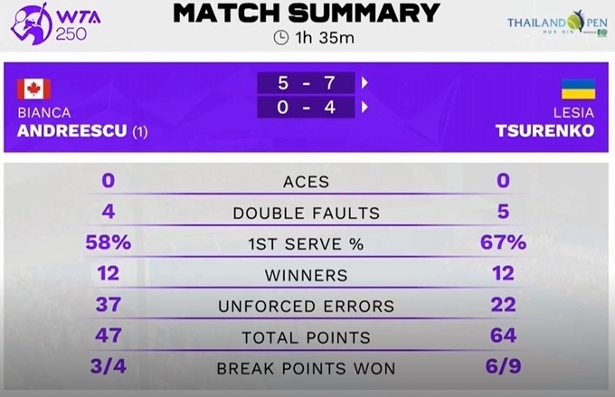 У матчі 1/2 фіналу українка обіграла першу сіяну Б'янку Андрєєску з Канади (№42 WTA), яка під час матчу відчувала проблеми із правим плечем і все ж таки вирішила знятися.