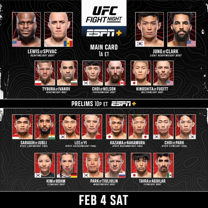 - Головний бій: Деррік Льюїс (США, 26–10, 1 NC) – Сергій Співак (Молдова, 15–3)