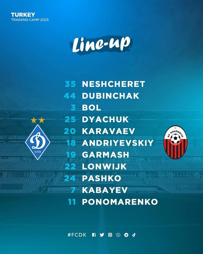 У понеділок, 6 лютого, відбудеться поєдинок товариського матчу, в якому змагатимуться «Динамо» Київ та північномакедонська «Шкендія». Матч пройде в Анталії (Туреччина), на полі стадіону «Mardan Stadium», початок о 16:00.