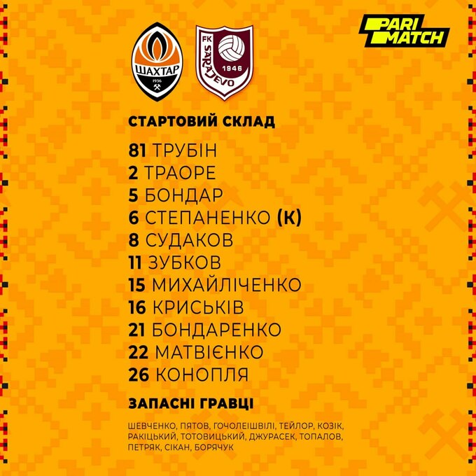 «Шахтар»: Трубін – Михайліченко (Топалов, 65), Матвієнко, Бондар, Конопля (Козік, 71) – Степаненко, Бондаренко – Судаков (Джурасек, 69), Криськів, Зубков – Траоре (Сікан, 77).