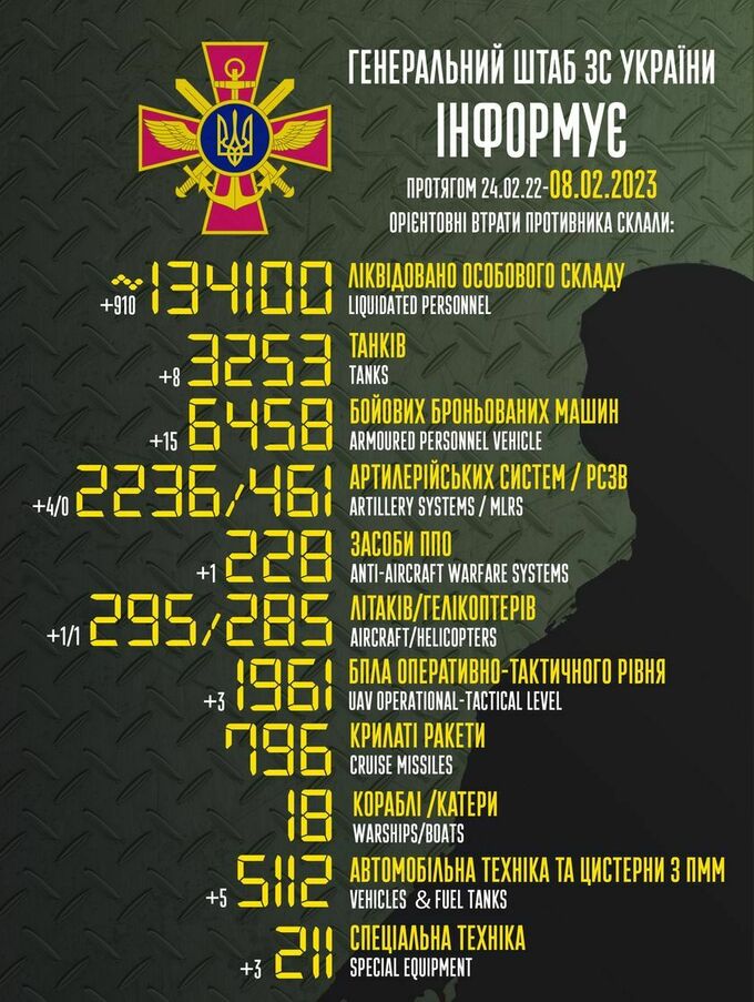 Пропонуємо до вашої уваги зведення загальних бойових втрат Росії з 24.02.2022 по 08.02.2023.