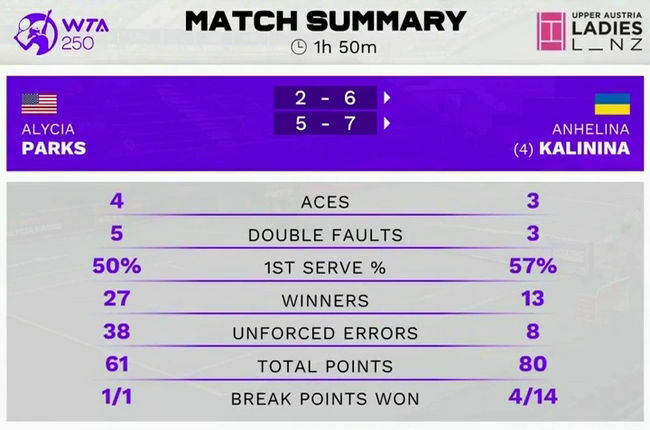 Перша ракетка України Ангеліна Калініна (WTA 31) у першому раунді турніру серії WTA 250 у Лінці (Австрія) обіграла Алішу Паркс у двох сетах за 1 годину та 50 хвилин.