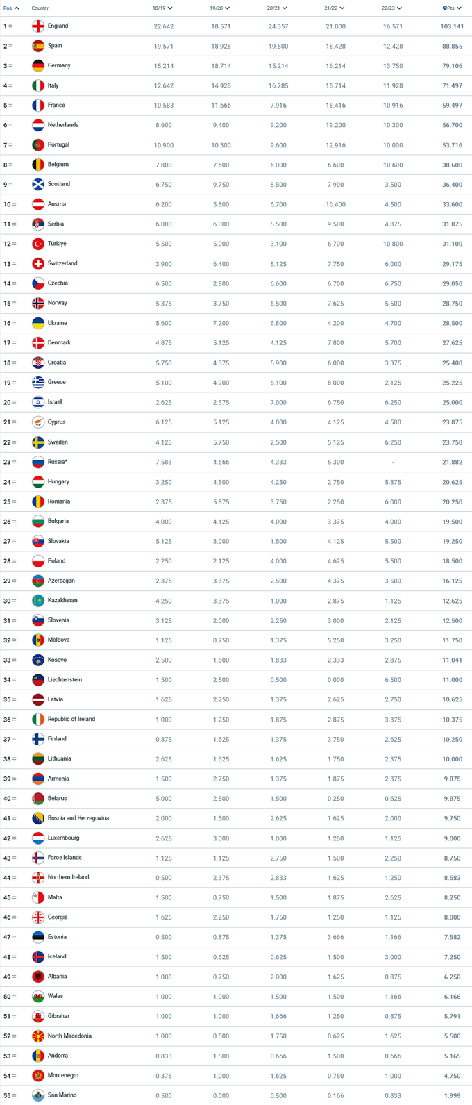 Хоча жоден російський клуб через дискваліфікацію не бере участі в поточному сезоні єврокубків, в УЄФА влітку 2022 року чомусь вирішили дати рф компенсацію і додали стільки балів, стільки у них набрано у найгіршому за 5 років сезоні – а саме 4.333.