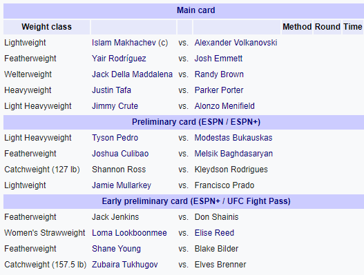 - Головний бій: 🖕 Іслам Махачов (23–1) – Александр Волкановськи (Австралія, 25–1), за пояс у легкій вазі