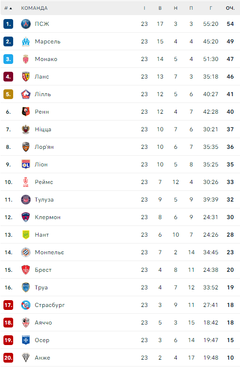 «ПСЖ» лідирує, маючи 54 очки. Далі йдуть: Марсель (49), Монако (47), Ланс (46), Лілль (41), Ренн (40).